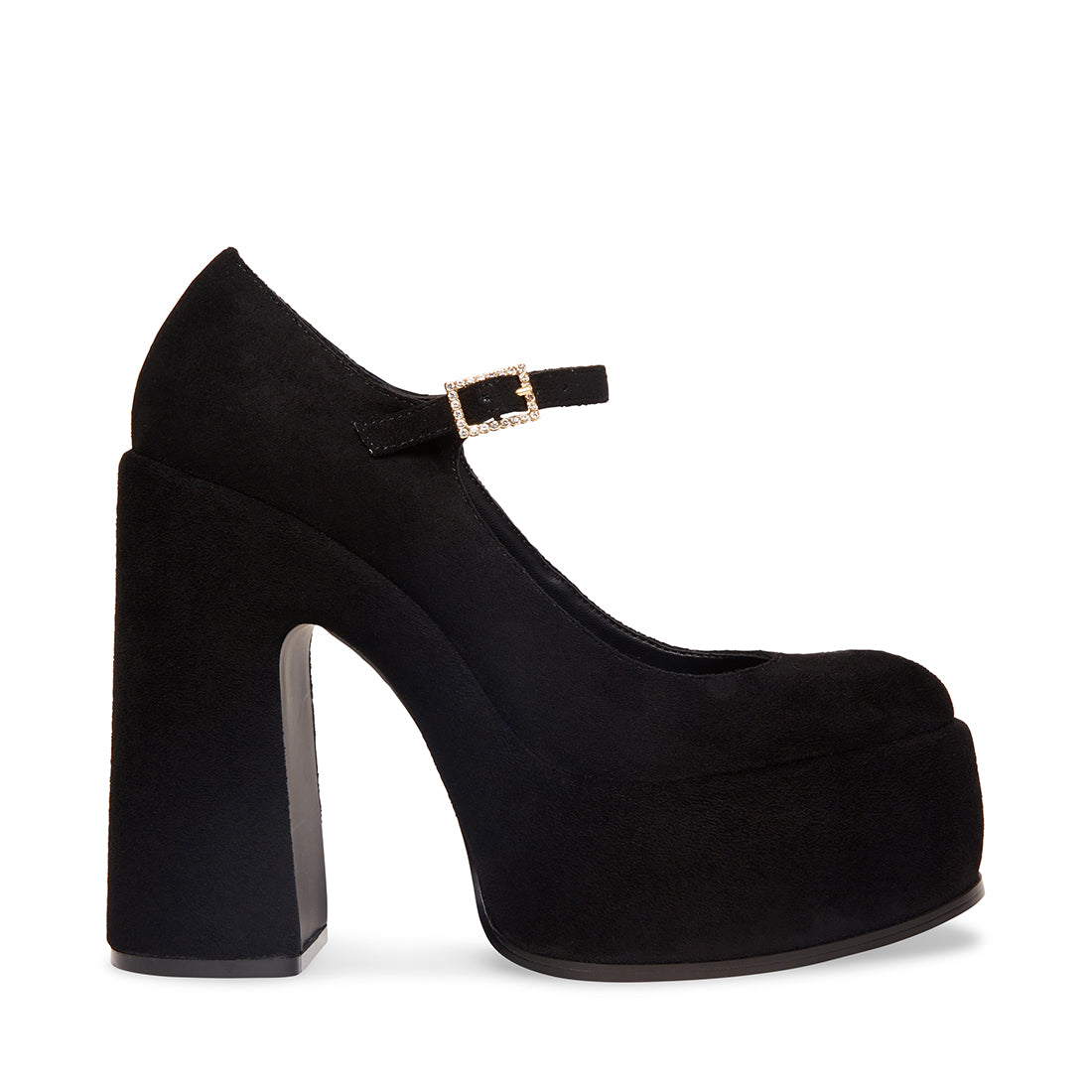 The Mary Jane gets an update with ELYSSA. a high platform heel in a smooth monochrome micro suede that's finished with a square rhinestone buckle.