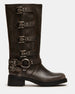 The ROCKY BROWN DISTRESSED WIDE CALF knee boot features the wide profile of an engineer boot with harness and buckle hardware adding an industrial edge and giving the design an adjustable fit.